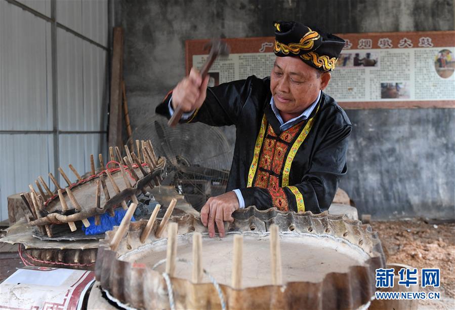 10月10日,在广西灵山县烟墩镇邓塘村烟墩大鼓传承基地,烟墩大鼓非遗传承人黄平修在维护鼓皮。 烟墩大鼓是广西钦州市灵山县独特而古老的民间打击乐器,其外形高大厚实,制作技艺精巧,演奏方法独特,已被列入广西壮族自治区非物质文化遗产名录。近年来,灵山县为保护和传承烟墩大鼓,建立烟墩大鼓传承基地,培养烟墩大鼓传承人,取得良好效果,古老的非遗文化不断敲响乡村文化振兴的鼓点。 新华社记者陆波岸摄