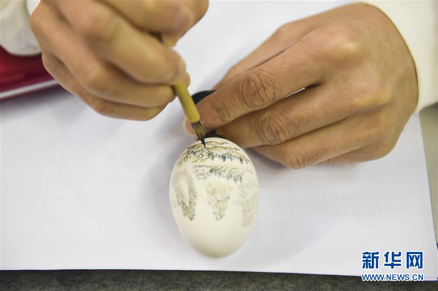10月11日,来自温州的一名选手在做蛋画。 新华社发(徐军勇 摄)