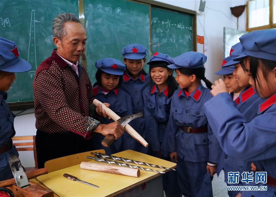 10月11日,肖卿华给学生展示唢呐的制作技艺。 当日,江西省于都县长征源小学邀请国家级非物质文化遗产项目——于都唢呐“公婆吹”艺术传承人肖卿华和徒弟来校,现场演示唢呐制作过程以及吹奏技巧,让学生们近距离领略传统文化的独特魅力。 新华社记者 胡晨欢 摄