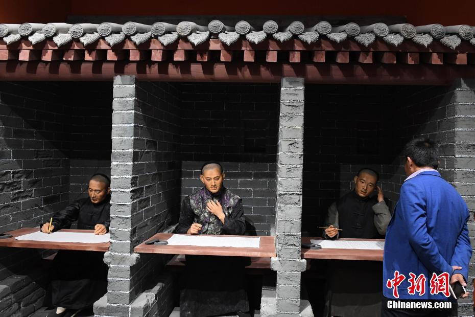 10月11日,甘肃清代贡院修缮完成开门迎客,还原的科举清代考试场景吸引民众。近日,拥有一百多年历史的甘肃贡院古建筑至公堂、观成堂修缮完成,这是甘肃贡院中心建筑至公堂历史上最大规模的一次修缮。创建于1875年的甘肃贡院是清末中国17家贡院之一,至公堂和观成堂这两座朱漆、彩绘、全木结构的古建筑代表了中国科举时期的整体建筑风格,现保存于兰州大学第二医院院内,这里曾是甘肃、青海、宁夏、新疆等地晚清学子的科举之地,最多时有3000多人在这里参加科举考试。中新社记者 杨艳敏 摄