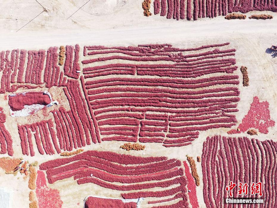 眼下正值丰收季节,新疆生产建设兵团第二师焉耆垦区各团场种植的17万亩辣椒进入采摘季。日前,在第二师二十一团航拍辣椒晾晒场面壮观,火红的辣椒犹如一张张红地毯铺展在广袤的戈壁滩上,成为秋季边疆的一道美景。据介绍,焉耆垦区是新疆辣椒的主产区之一,土地肥沃,光照时间长,种植的辣椒红色素高、色泽鲜艳、商品率高,质优价廉,深受国内外客商的青睐。晾晒好的辣椒大部分销往山东、陕西、河北、山西等地,辣椒产业已成为当地经济发展的龙头产业。闫志江 摄