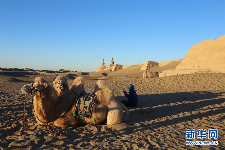 10月11日,当地群众带着骆驼在黑城遗址前等待游客。 新华社记者安希雅摄