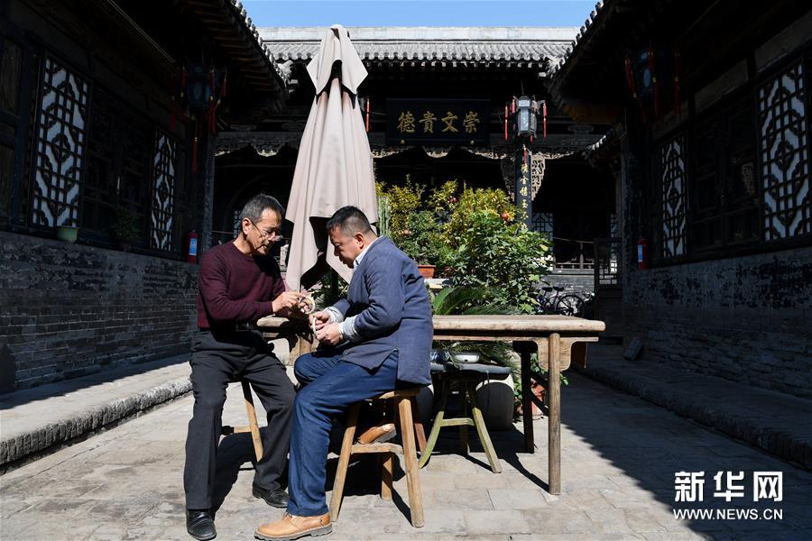 10月11日,山西省晋中市平遥古城内,刘兴东(右)在听取父亲刘广厚的建议。 新华社记者 杨晨光 摄