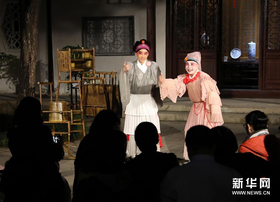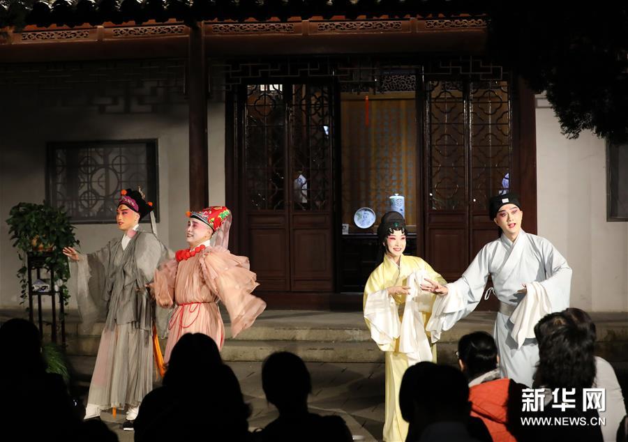 2018年10月14日晚,浸入式园林版昆曲《浮生六记》全本版在苏州古典园林沧浪亭亮相。观众可随着演员的表演在园林中走走停停,沉浸其中,一边聆听昆曲的唯美曲调,一边领略园林的诗意之美。 新华社发(徐志强 摄)