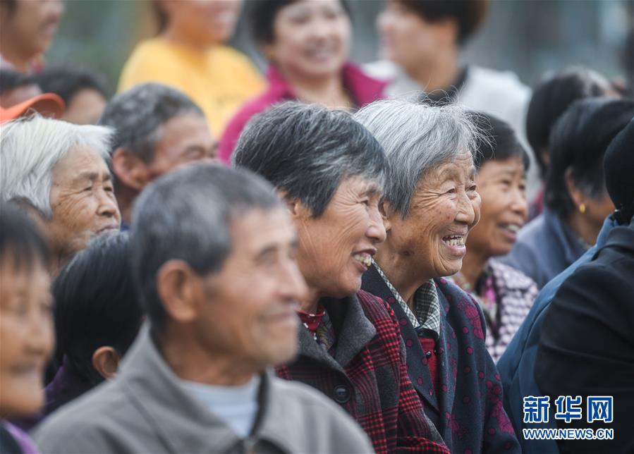 10月16日,保永村老人们观看演出。当日,浙江省湖州市东林镇保永村举行“情暖金秋 欢度重阳”文化走亲活动,迎接重阳节的到来。 新华社记者 徐昱 摄