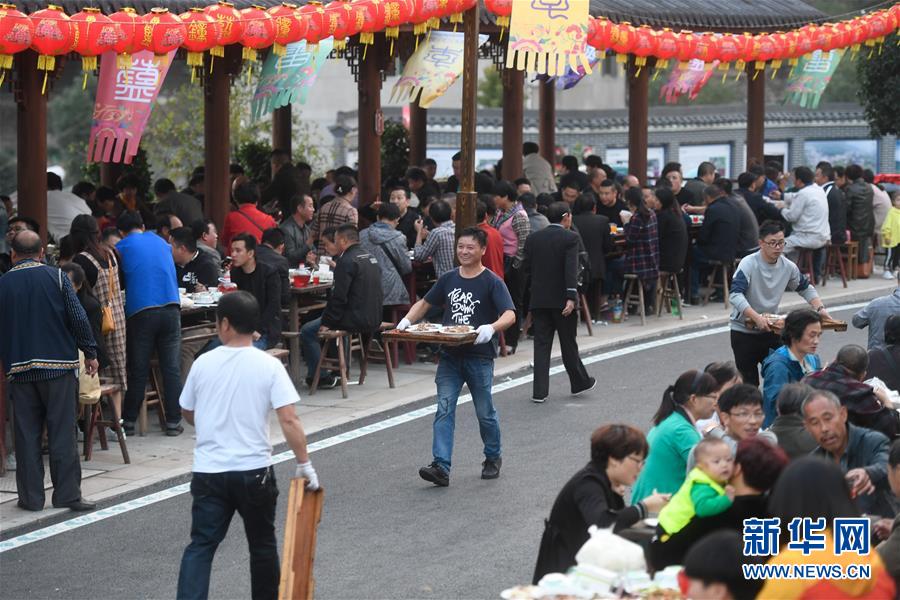 10月17日,村民与宾客在龙峰民族村参加“长桌宴”。 当日,在浙江省桐庐县莪山畲族乡龙峰民族村,一百桌宴席沿道路摆成一字长蛇阵,四方宾客和当地村民一起品尝着具有畲族特色的菜肴,场面颇为壮观。 新华社记者 黄宗治 摄