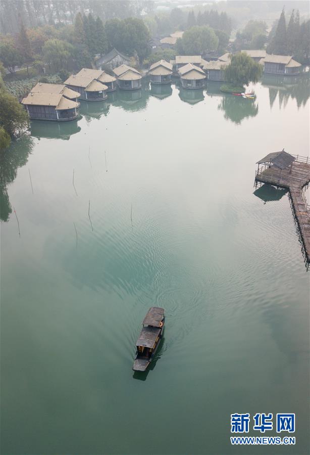 10月18日,一艘游船行驶在乌镇水道上(无人机拍摄)。新华社记者翁忻旸摄