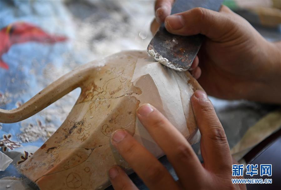 10月18日,在江西景德镇,工作人员修复一件瓷器。 新华社记者 万象 摄