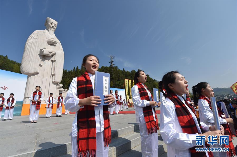10月18日,学生在南平武夷山市五夫镇朱子雕像广场上诵读《朱子家训》。 当日,朱子故里福建南平市在武夷山等地举行多种多样的文化活动,纪念朱子诞辰888周年。 新华社记者 宋为伟 摄