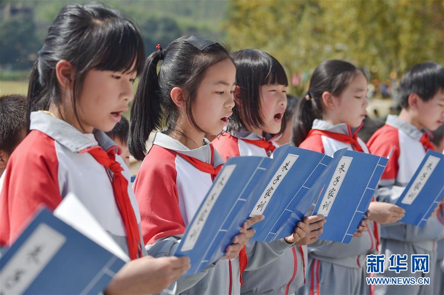 10月18日,在福建南平武夷山市五夫镇朱子雕像广场,学生在诵读《朱子家训》。 当日,朱子故里福建南平市在武夷山等地举行多种多样的文化活动,纪念朱子诞辰888周年。 新华社记者 宋为伟 摄