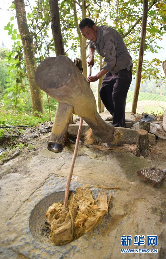 10月18日,利川市毛坝镇老木村手工造纸匠田德科用石碓舂碎“竹麻”。