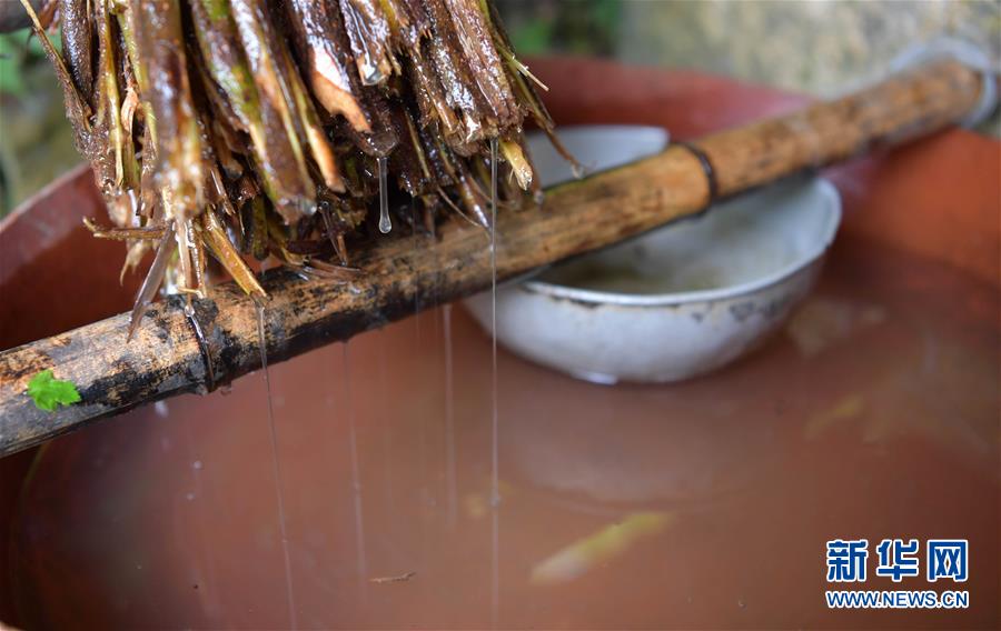 10月18日,利川市毛坝镇老木村手工造纸匠田德科在过滤猕猴桃枝的树浆。 新华社发(杨顺丕 摄)