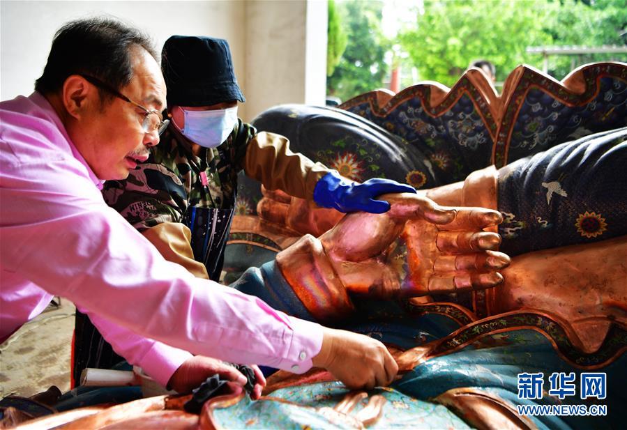 10月18日,林辉(左)指导工人打磨铜铸胎掐丝珐琅作品。新华社记者 魏培全 摄