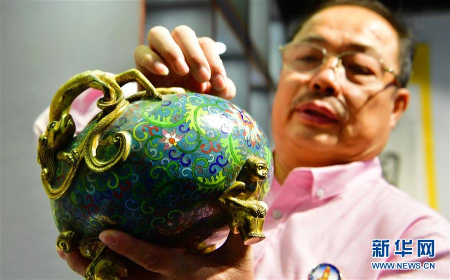 10月18日,林辉展示一件林氏铜铸胎掐丝珐琅工艺器皿。 新华社记者 魏培全 摄