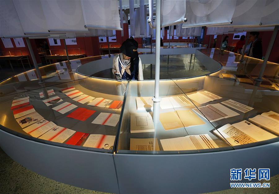 10月18日,观众在参观书籍设计作品。 当日,第九届全国书籍设计艺术展在南京金陵美术馆开幕。本届展览和评奖活动共收到全国338家出版单位以及部分高校艺术院系师生的书籍设计作品3108种,分社科、科技、艺术、教育等10类。经过评审,共有764种作品入围并获奖。 新华社记者 孙参 摄