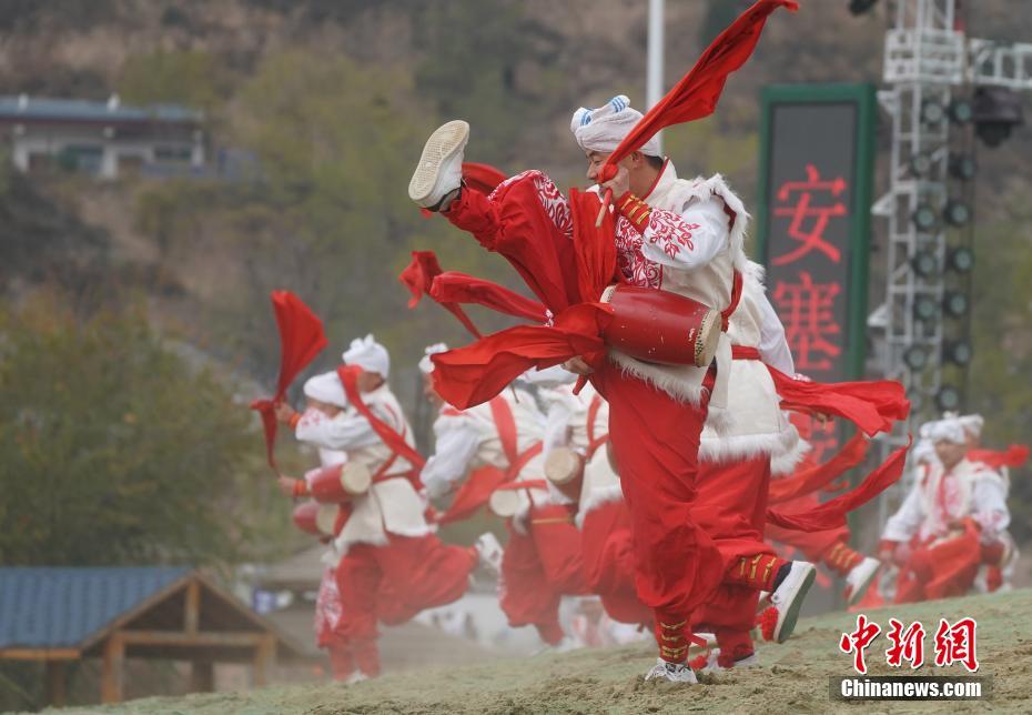 10月19日,陕北安塞冯家营腰鼓表演。当日,“陕北新天地 鼓舞新时代”聚焦安塞·文化脱贫----魏塔、冯家营、西营民俗文化村启动仪式在安塞区西营举行。2018年,安塞区大力实施“文旅兴业”发展战略,深度挖掘黄土风情文化资源,投资5000余万元精心打造了西营“陕北信天游”演唱村、冯家营“千人腰鼓”表演村、魏塔“东方毕加索”绘画村3个民俗文化村,大力发展文化旅游产业。 中新社记者 毛建军 摄