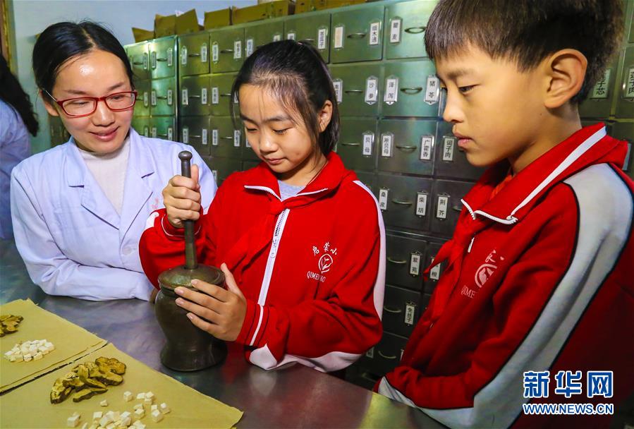 10月22日,安平县启蒙小学学生在安平县中医院医生的指导下体验用传统工具加工中草药。 当日是世界传统医药日,河北省安平县启蒙小学组织学生走进安平县中医院,通过参观中药房、认识常见中药、感受中药加工等方式,向小学生普及中医药知识,弘扬传统中医药文化。 新华社记者李晓果摄