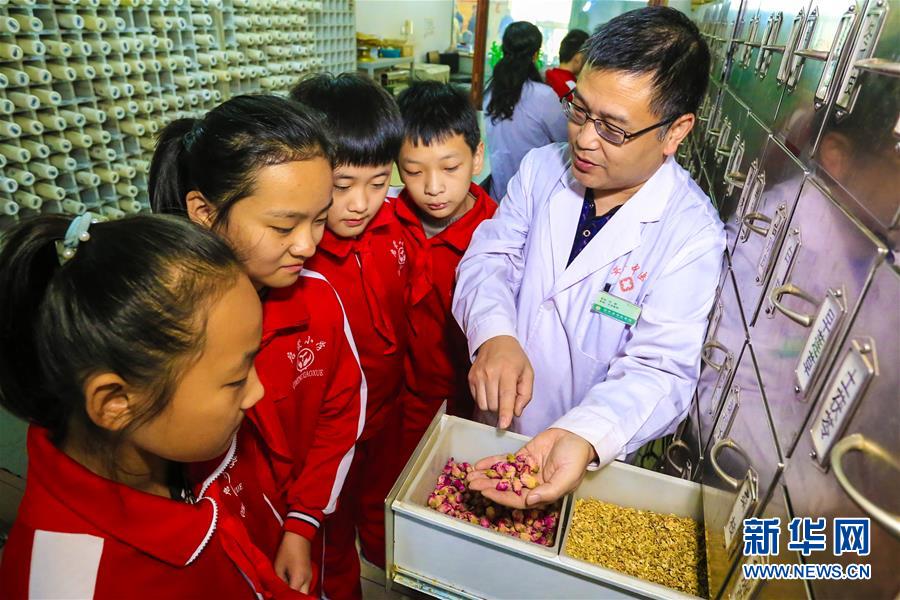 10月22日,安平县启蒙小学学生在安平县中医院的中药房识别各类中药材。 当日是世界传统医药日,河北省安平县启蒙小学组织学生走进安平县中医院,通过参观中药房、认识常见中药、感受中药加工等方式,向小学生普及中医药知识,弘扬传统中医药文化。 新华社记者李晓果摄