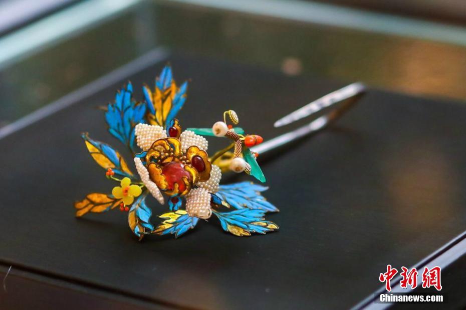 10月22日,在重庆蘭园“国艺主题艺术季”上,点翠艺术家马荆棘收藏和设计的30组点翠艺术品亮相,将点翠工艺那抹沁人心脾的蓝色映入观众眼帘。点翠工艺是一项中国传统的金银首饰制作工艺,是首饰制作中的一个辅助工种,起着点缀美化金银首饰的作用。图为点翠发簪。钟欣 摄