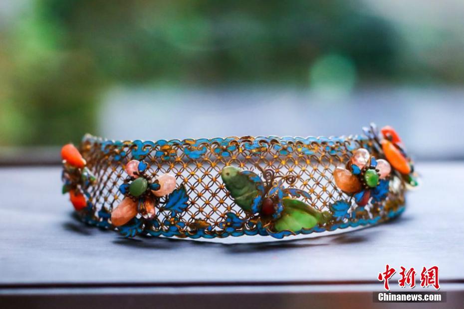 10月22日,在重庆蘭园“国艺主题艺术季”上,点翠艺术家马荆棘收藏和设计的30组点翠艺术品亮相,将点翠工艺那抹沁人心脾的蓝色映入观众眼帘。点翠工艺是一项中国传统的金银首饰制作工艺,是首饰制作中的一个辅助工种,起着点缀美化金银首饰的作用。图为点翠手镯。钟欣 摄