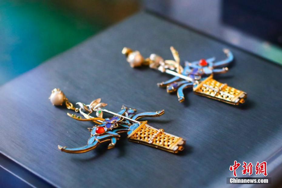 10月22日,在重庆蘭园“国艺主题艺术季”上,点翠艺术家马荆棘收藏和设计的30组点翠艺术品亮相,将点翠工艺那抹沁人心脾的蓝色映入观众眼帘。点翠工艺是一项中国传统的金银首饰制作工艺,是首饰制作中的一个辅助工种,起着点缀美化金银首饰的作用。图为点翠耳环。钟欣 摄