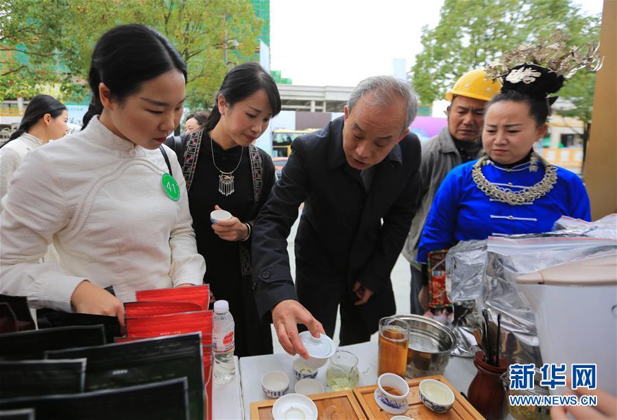 10月22日,人们在茶艺职业技能大赛场外参加品茗活动。 当日,2018年贵州省茶艺职业技能大赛总决赛在贵阳市观山湖区开赛,来自贵州各地的近200名茶艺师将在为期三天的比赛中展开比拼。 新华社发(杨武魁 摄)