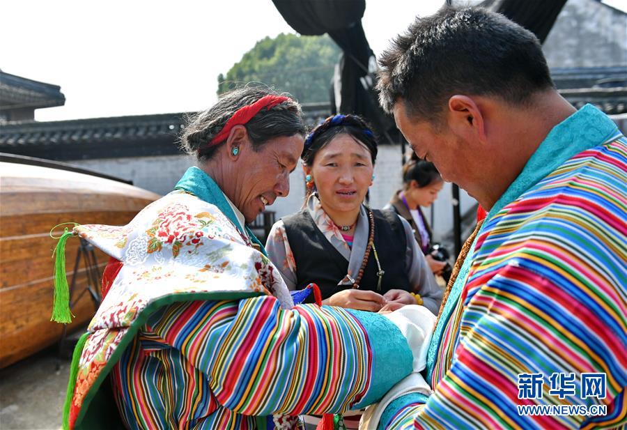 10月23日,西藏日喀则市昂仁县迥巴藏戏团的演员在做演出前的准备。 当日,西藏日喀则市昂仁县迥巴藏戏团在浙江乌镇举行演出,吸引了众多游客驻足观赏。这个由农牧民组成的藏戏团继去年后再次在乌镇戏剧节亮相,将在这里进行为期六天的展演。 新华社记者 张汝锋 摄