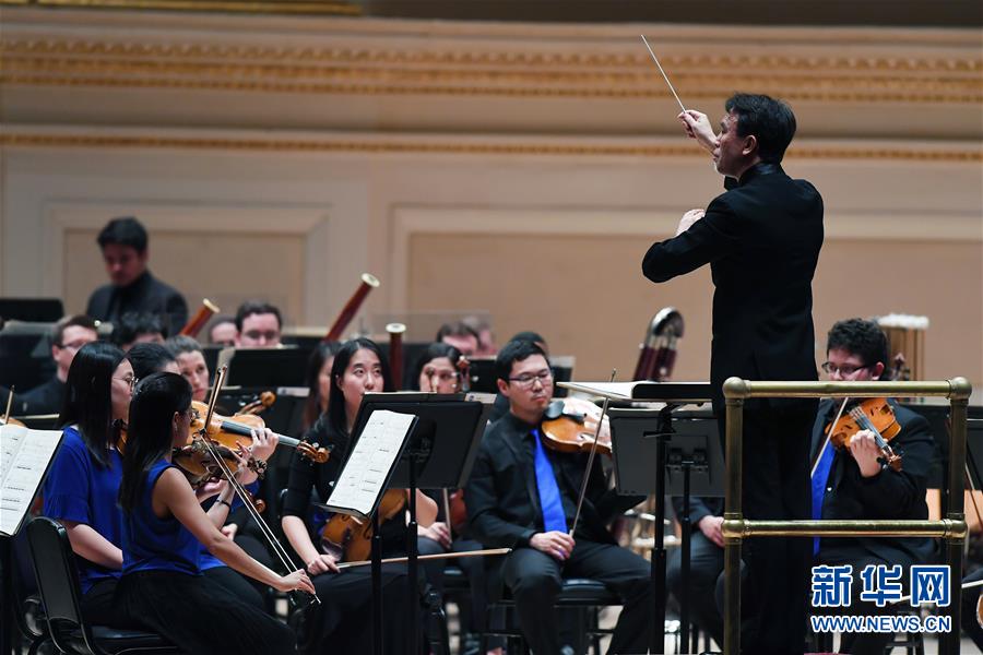 10月22日,在美国纽约卡内基音乐厅,巴德美中音乐研习院院长、中国当代音乐节艺术总监蔡金冬(前右)在收官音乐会上指挥。由美国巴德音乐学院与中国中央音乐学院共同打造的首届中国当代音乐节22日晚在纽约卡内基音乐厅举行收官音乐会。首届中国当代音乐节以“回首往事·展望未来:21世纪的中国作曲家”为主题,由巴德音乐学院下属的巴德美中音乐研习院主办。为期4天的音乐节共举办了3场音乐会,用音符传达中国作曲家创作视野里的历史与未来。新华社记者 李睿 摄