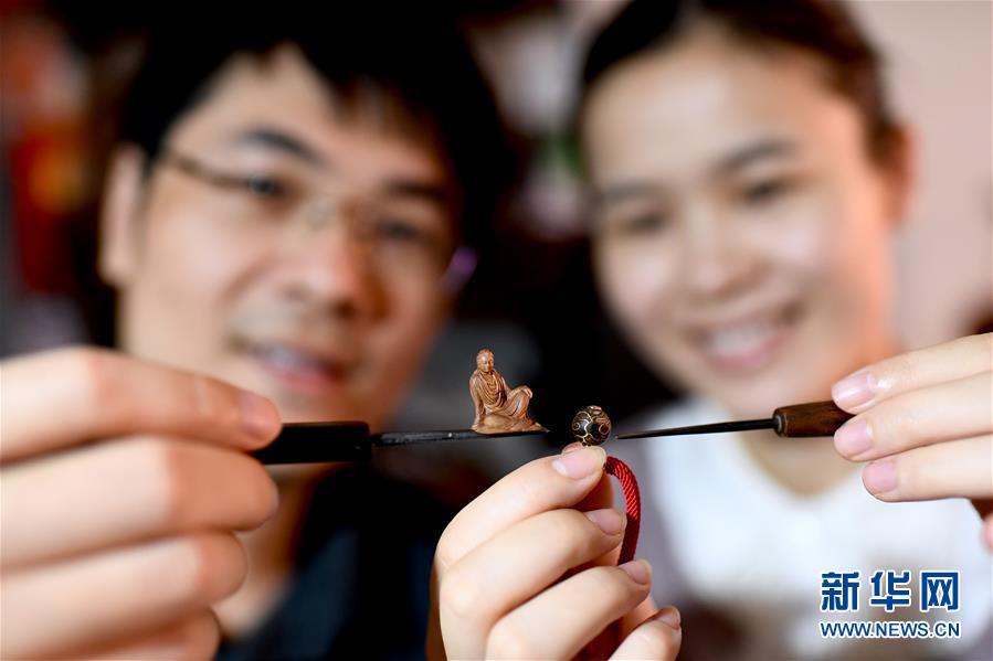 10月24日,林建军(左)、陈琴夫妇在福建莆田的工作室展示二人的微雕佛像和沉香镶金饰品。 福建省莆田市木雕工艺师林建军16岁开始拜师学习木雕技艺,20多年来刀耕不辍,刻苦钻研莆田“精微透雕”传统技法,2018年获评福建省非物质文化遗产保护项目“莆田木雕”代表性传承人。 2014年,林建军与同乡陈琴喜结连理。受丈夫影响,陈琴也逐渐喜爱上木雕工艺,并吸收“金银错”中国传统技艺,加工制作沉香镶金饰品。夫妻二人互学互帮,利用进校讲课、收徒传艺、非遗展示等方式弘扬传承莆田木雕技艺,用勤劳精巧的“鸳鸯刀”刻画出一条幸福的人生路。 新华社记者姜克红摄