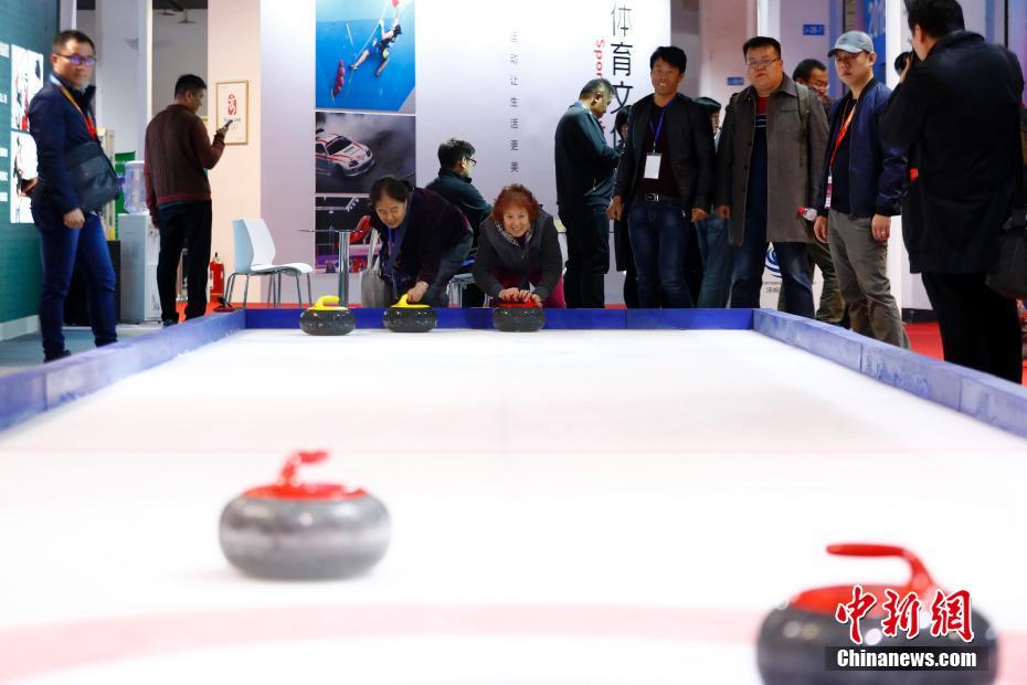 民众在“爱柯·艾尔豪斯”模块化装配冰场上体验冰壶运动,该模块化冰场可根据实际情况建设不同大小的场地,还可提供低能耗、省时高效的制冰解决方案。中新社记者 富田 摄