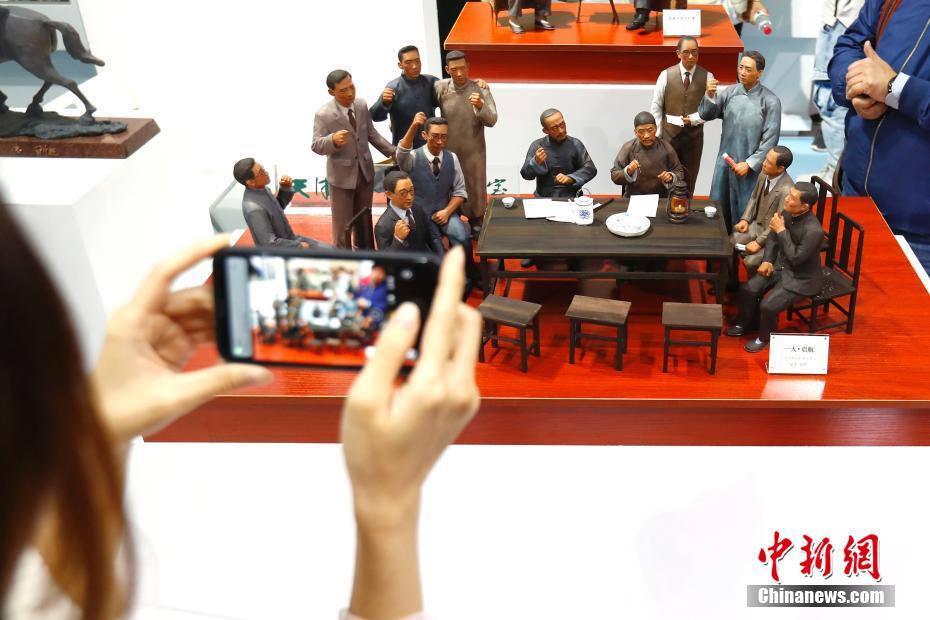 天津泥人张作品《一大·启航》吸引观众。中新社记者 富田 摄