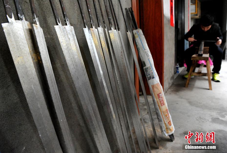 由于历史变迁,湛卢宝剑及铸造工艺失传。1985年,松溪艺匠根据史料,整理、研究、挖掘传统工艺,并与北京、南京等科研单位合作,解决了传统铸剑中剑坯热处理问题,用手工方法铸炼成湛卢宝剑,使失传已久的古剑重放光彩。中新社记者 张斌 摄