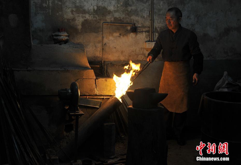 如今,湛卢宝剑,古朴典雅,刚柔并俱,纯手工制作,以锋利精巧著称,具有剑背挺直,折弯度大等特点,成为海内外人士觅藏的艺术珍品和健身器具。中新社记者 张斌 摄