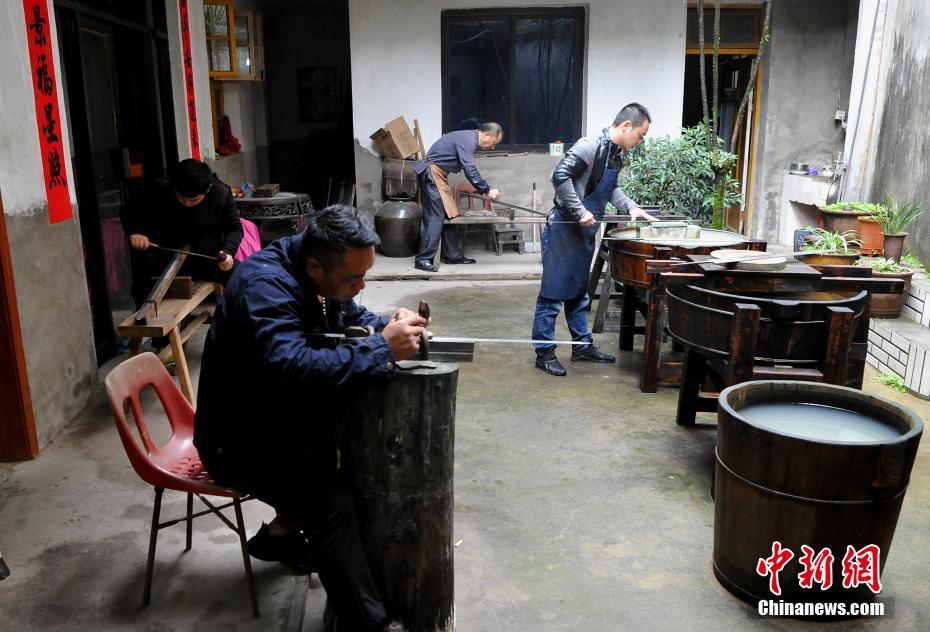 图为范志华在工作室和徒弟们一起铸剑,所铸的每把剑,从剑身锻造、剑鞘制作到装具配置,全部由手工精心打造,要经过上百道工序。中新社记者 张斌 摄