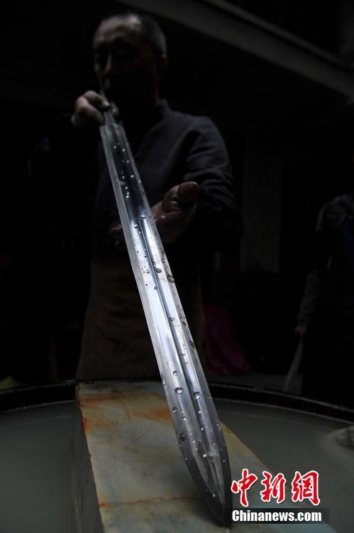 图为范志华正在查看铸造中的剑身,经过无数次磨砺使宝剑寒光逼人。中新社记者 张斌 摄