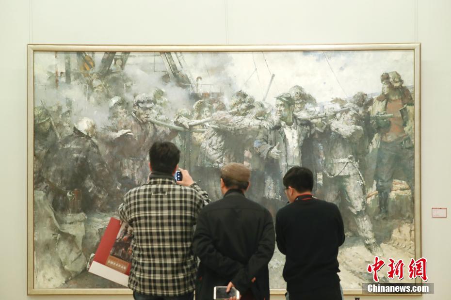 2016年8月16日,谷钢在创作《红军长征到陕北》巨幅油画时,不幸累倒在画架旁。本次展览展出谷钢油画作品约60件。中新社记者 盛佳鹏 摄
