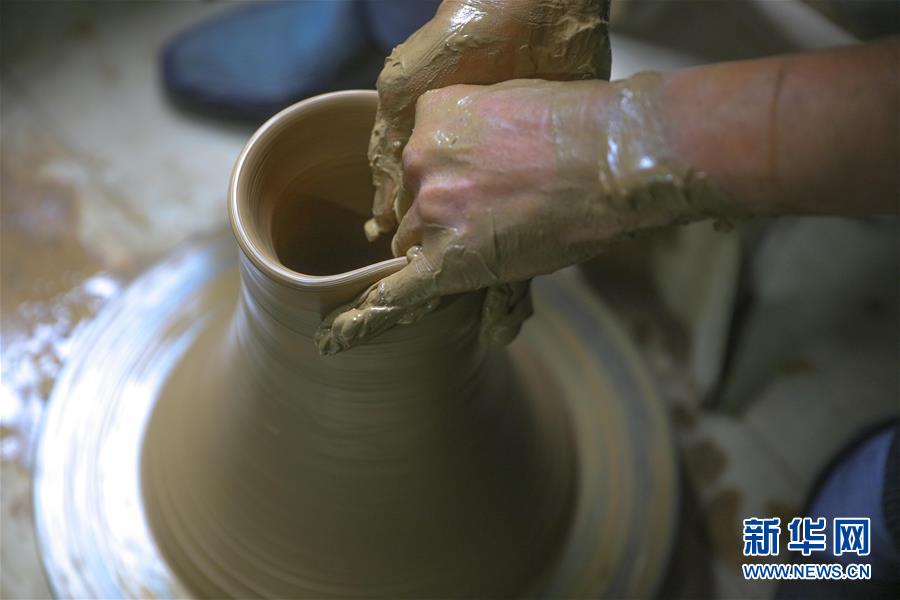 10月25日,彩陶艺人王京胜在制作界首彩陶。