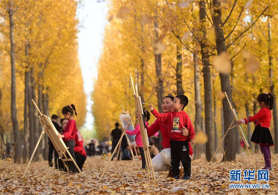 10月25日,河北沧州职教中心幼儿园的孩子来到大运河森林生态园内赏秋写生,用手中的画笔留住自然美景。 新华社发(傅新春 摄)