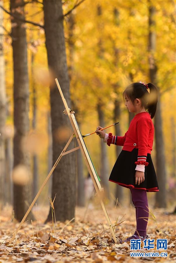 10月25日,河北沧州职教中心幼儿园的孩子来到大运河森林生态园内赏秋写生,用手中的画笔留住自然美景。 新华社发(傅新春 摄)