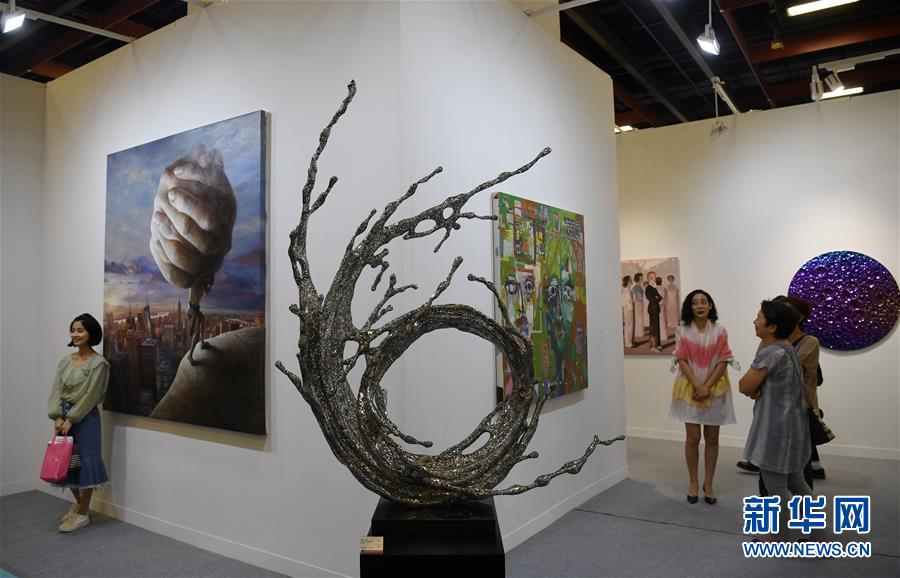 10月26日,观众在侨福芳草地画廊展区参观。 当日,为期四天的台北艺术博览会开幕,艺博会以“无形的美术馆”为主题,鼓励“收藏”与“分享”,并规划“科技艺术展”,关注新时代的脉动与趋势。 新华社记者金良快摄