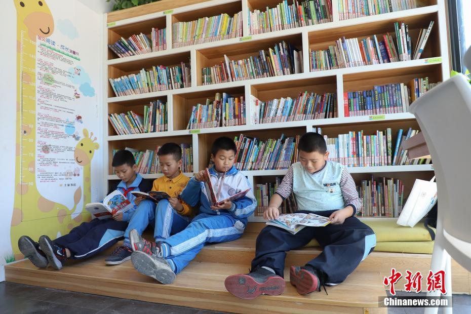 10月31日,贵州沿河,四名小学生在阅读书籍。当日,记者探访位于贵州省铜仁市沿河土家族自治县民族文化广场的“土家书房”。“土家书房”是以土家文化为特色的24小时自助图书馆,建筑面积26.25平方米,藏书3000册。该书房采取人脸识别智能管理系统,具有自助借还、自助办证等功能。中新社记者 瞿宏伦 摄