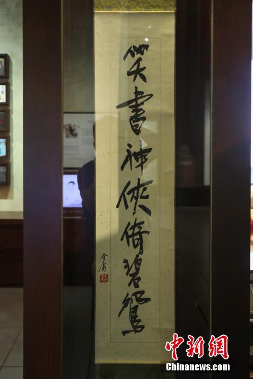 10月31日,香港文化博物馆金庸馆内收藏有金庸以14本小说首字创作的经典对联“飞雪连天射白鹿 笑书神侠倚碧鸳”亲笔原稿。当日,大批市民前往香港文化博物馆金庸馆参观,追忆大师的武侠世界。以笔名“金庸”写作多部武侠小说的著名作家查良镛10月30日下午在香港逝世,享年94岁。中新社记者 谢光磊 摄