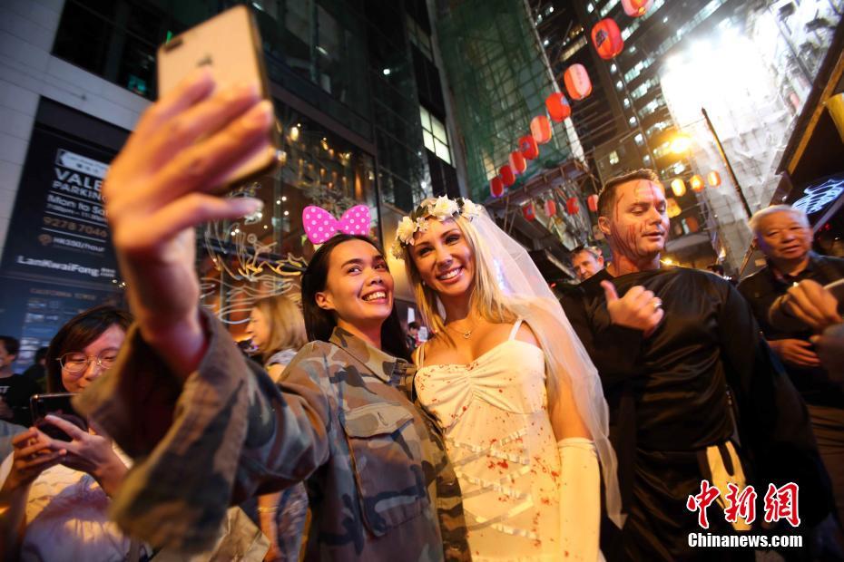 10月31日晚,香港兰桂坊著名酒吧一条街上,前来感受万圣节派对的市民和游客络绎不绝。每年10月,香港摇身变成“万圣狂欢之城”。盛大多样的万圣节活动、热闹逗趣的节日气氛、惊喜十足的美食,吸引四面八方的游客光临。图为打扮成“哗鬼”新娘的游客和途人兴高采烈合影。中新社记者 洪少葵 摄