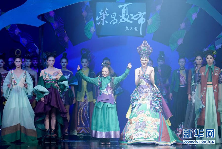 10月31日,著名时装设计师张义超(前中)和模特在北京举行的中国国际时装周“荣昌夏布·张义超创意作品发布会”上谢幕。 新华社记者 陈建力 摄
