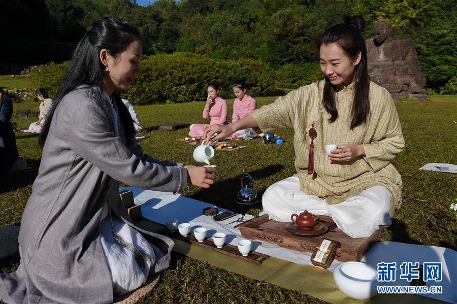 金秋时节,身着古朴服饰的福建武夷山茶人在户外摆茶席,在空气清新的大自然里感受茶文化。