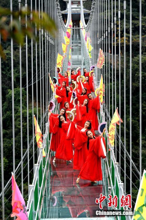 188米高空玻璃悬桥上 古装“侠女”翩翩起舞