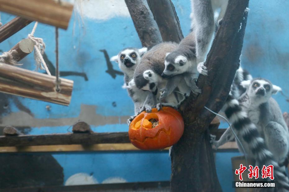 11月1日,青藏高原野生动物园为园内127种3000余只野生动物“发放”万圣节南瓜“福利”。图为收到南瓜“福利”的马达加斯加环尾狐猴。中新社记者 罗云鹏 摄