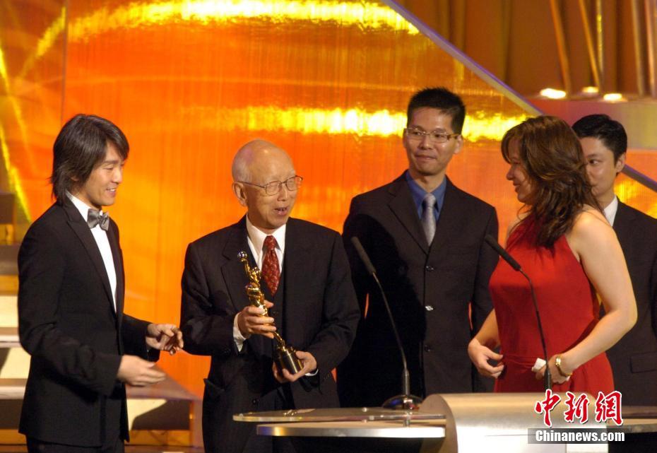 2005年3月28日,第24届香港电影金像奖颁奖礼上,已故武打巨星李小龙获中国电影世界光辉之星奖。图为香港电影大亨邹文怀、明星周星驰向李小龙女儿颁奖。中新社记者 洪少葵 摄