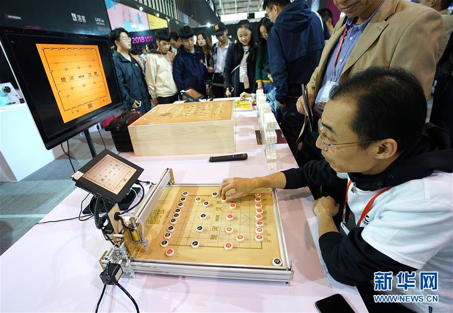 11月2日,观众在“下棋机器人”展台前和机器人下中国象棋。 当日,2018中国(南京)文化科技融合成果交易会在南京开幕。 新华社记者 孙参 摄