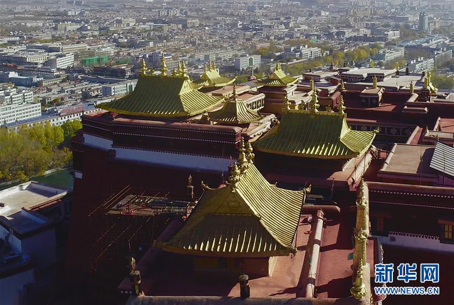 修缮后的布达拉宫金顶群(11月7日无人机拍摄)。新华社记者普布扎西 摄